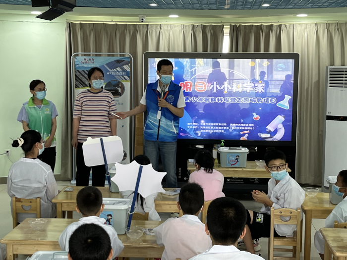 在滨海新区图书馆少儿馆区,孩子们在工作人员的带领下,身穿白大褂,手拿新奇装备,“变身”小小科学家。这是滨海新区图书馆“明日小小科学家”暑期活动现场。活动中,老师详细地为孩子们讲解实验所需要准备的试管、试管架、滴管、量杯、食用色素、搅拌棒、洗洁精等各类材料。
