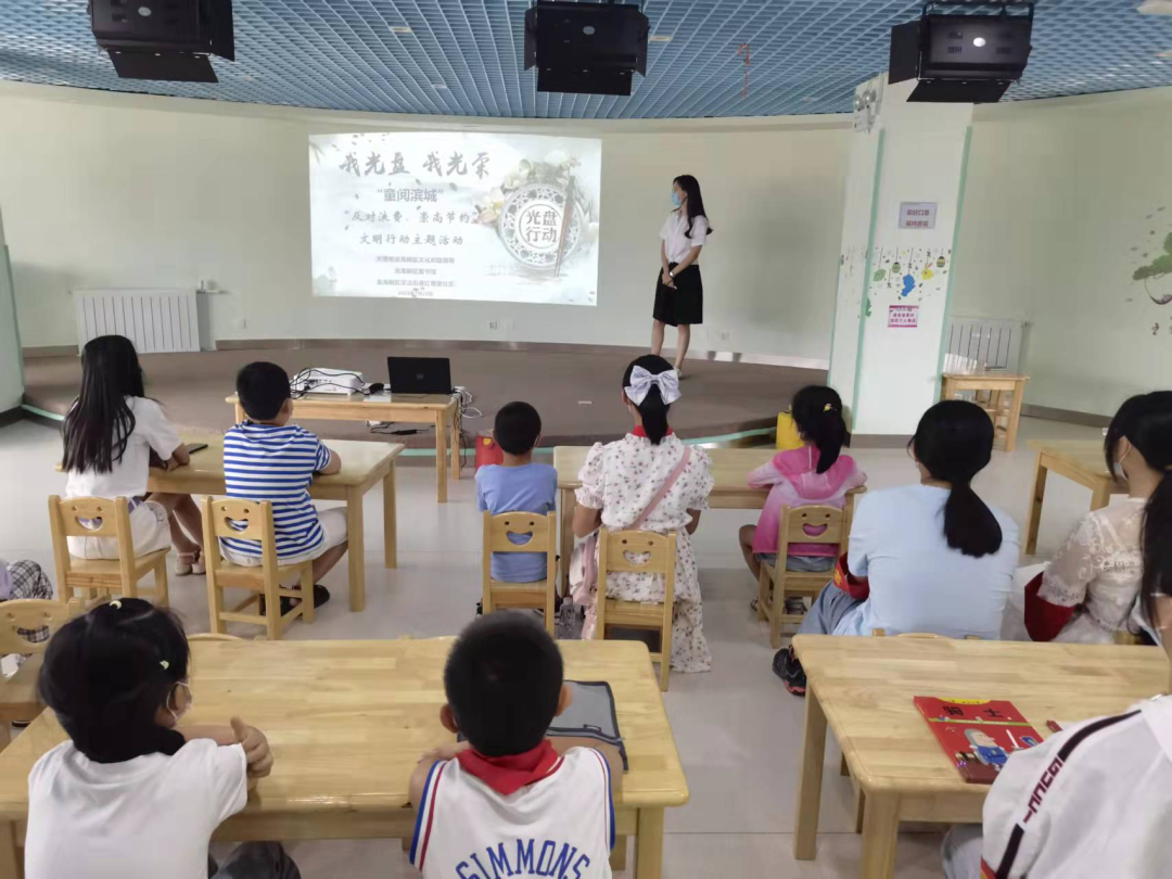 为深入推进未成年人思想道德建设,教育引导未成年人养成节约粮食、制止浪费的文明行为习惯。滨海新区图书馆(少儿馆区)开展“反对浪费、崇尚节约”主题活动。活动在动画视频《节约粮食从我做起》中开始,图书馆志愿讲解员李老师结合视频为孩子们讲述了浪费粮食的严重后果,希望大家能懂得如何杜绝餐饮浪费。然后用幻灯片的形式让孩子们了解了粮食的生产过程,让孩子们养成爱粮、惜粮的意识,让大家更深刻地认识到勤俭节约的重要性。告诉孩子们要合理点菜,不贪丰求盛,养成剩菜打包的习惯,身体力行参与到节约的行动中。为了增加现场的互动性,同时加入知识问答的环节,让同学们在一问一答中加深对“厉行节约,反对浪费”的意识和理解,增强勤俭节约、反对铺张浪费的自觉性。